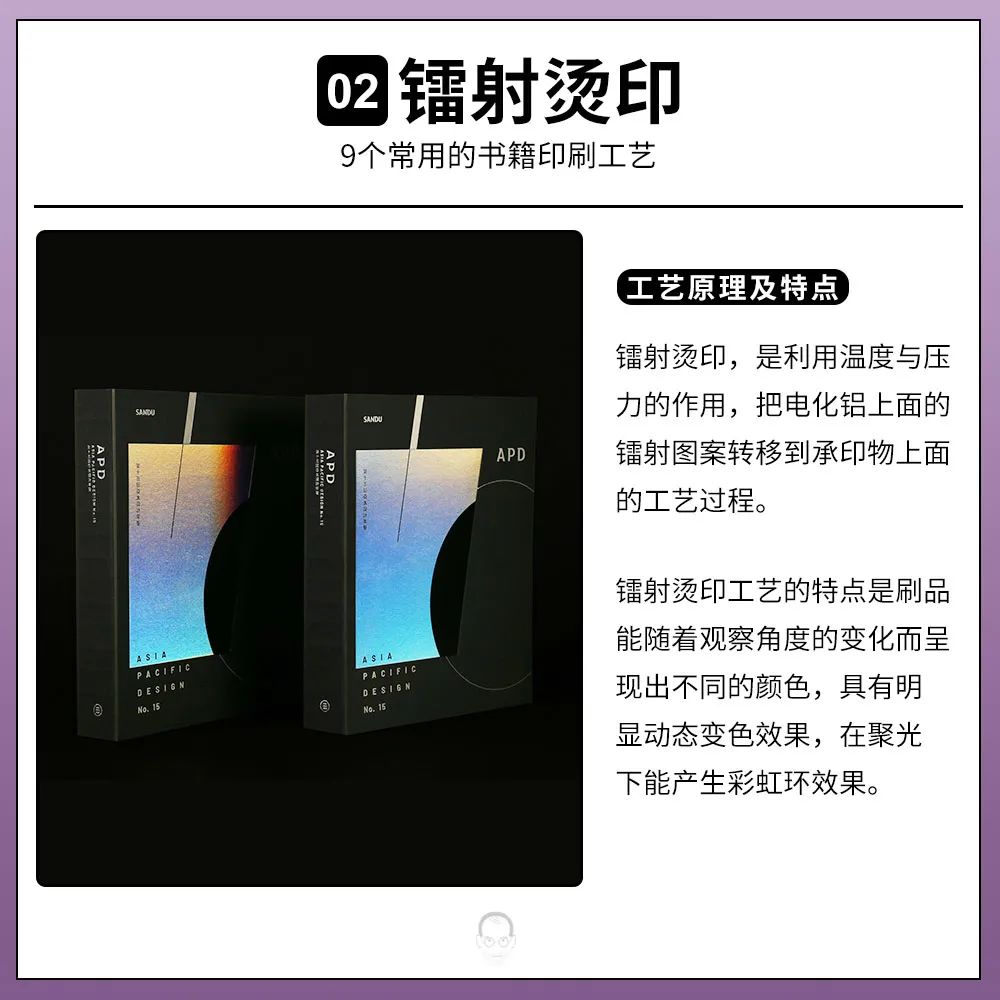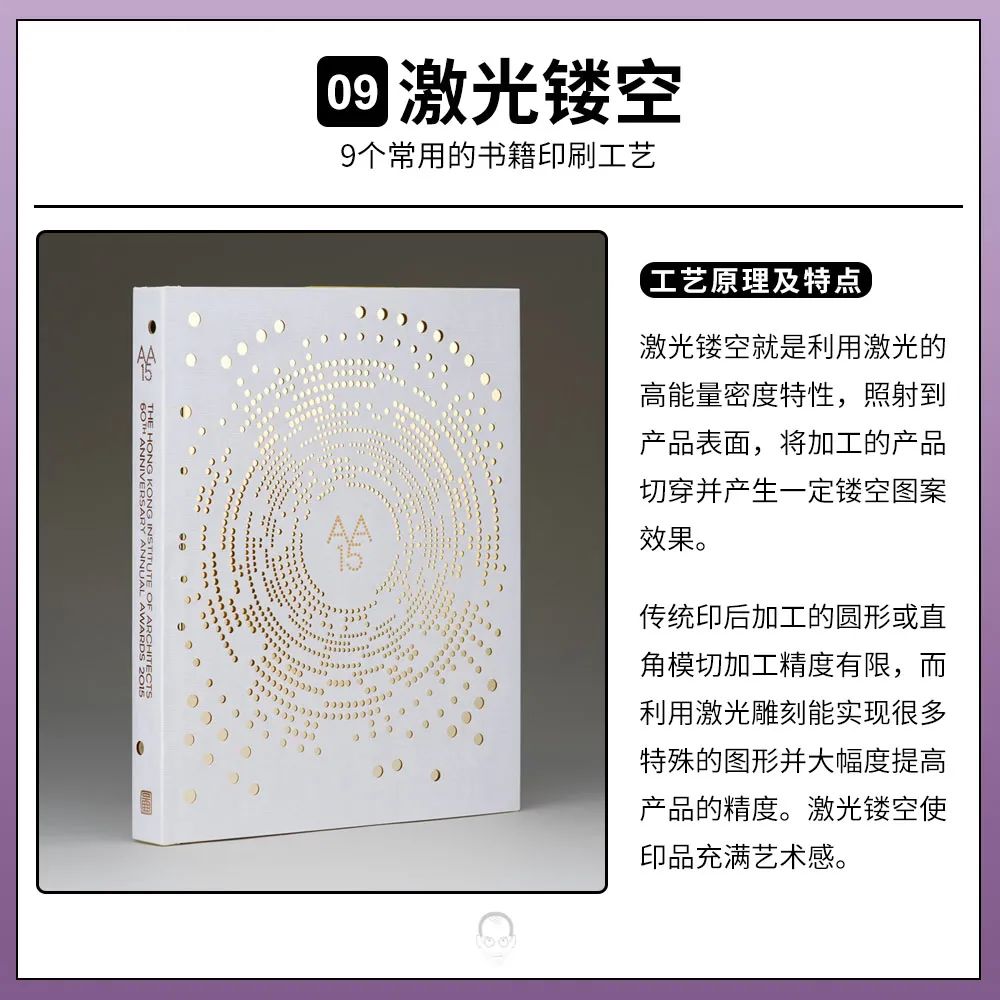 今天整理了9个常用的书籍印刷工艺,分别有:烫金工艺、镭射烫印、覆膜工艺、模切工艺、局部UV、压凹工艺、击凸工艺、刷边工艺、激光镂空。