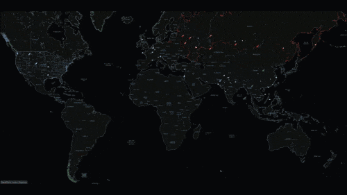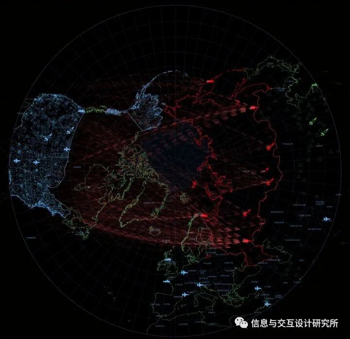 这幅地图展示的是全世界核导弹基地和核武器库。地图采用自定义极地坐标投影法,并结合 Great Arcs 来展现核导弹的运行轨迹。