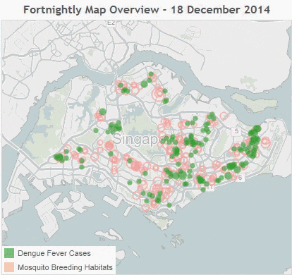 Tableau 动态仪表盘显示蚊子繁育习惯于登革热发病区域的关系。