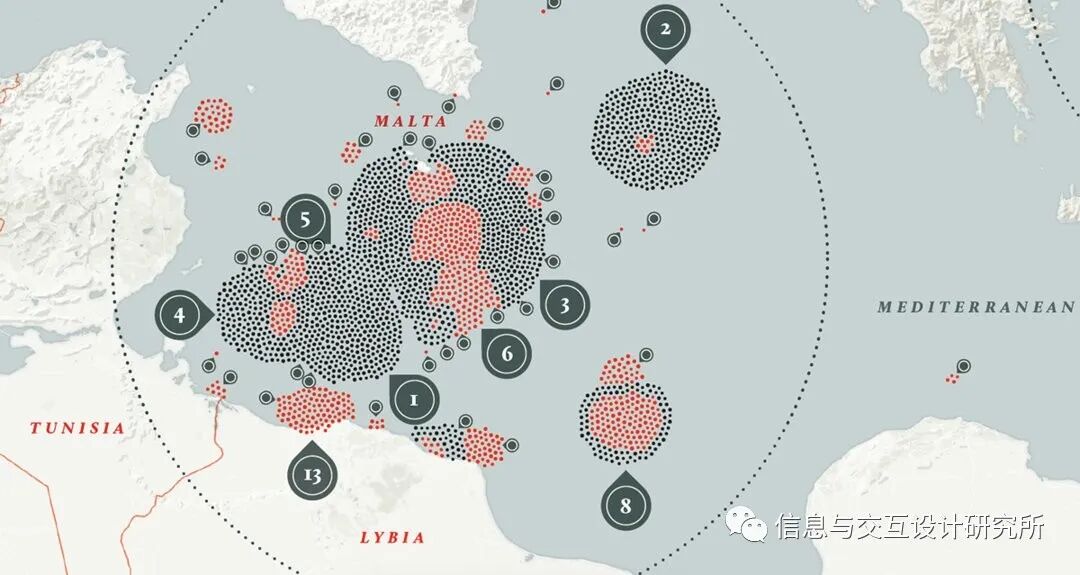 这个记录失踪移民的项目,是由国际移民组织(IOM)的全球移民数据分析中心(GMDAC)与媒体与通讯事业部(MDC)共同发起的,制作图表的是 Valerio Pellegrini 和 Michele Mauri。详细记录了自 2013 年以来难民向欧洲迁移过程中的死亡数据。