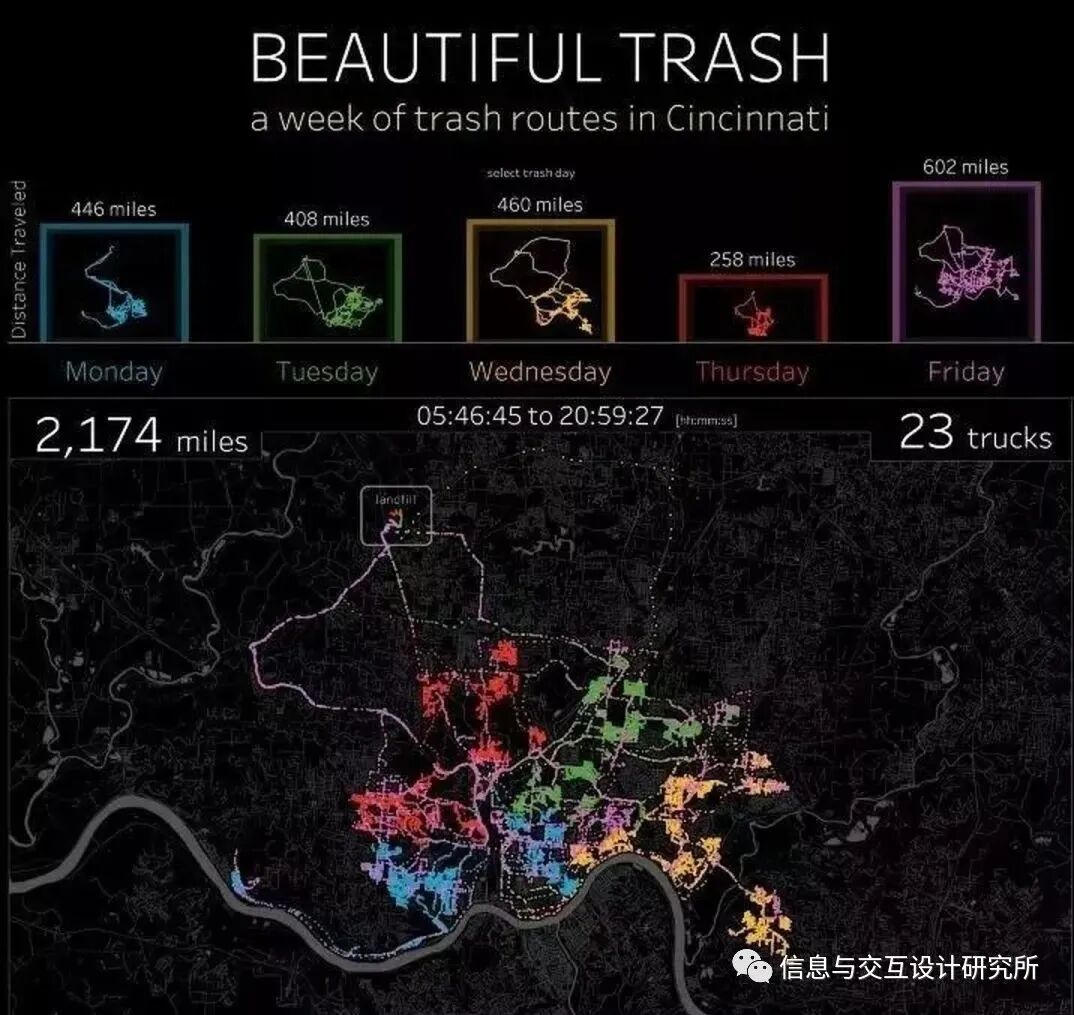 很多人可能对“垃圾”这样的主题避而远之,而Jeff则为垃圾生命的最后轨迹制作一副精美的地图。他使用柱状图、条形图、详尽的数据基础来处理信息,地图的颜色则采用了霓虹灯效果,最终完成了这幅美丽且“有意义”的作品。