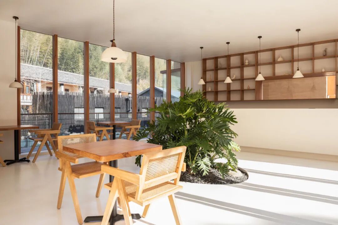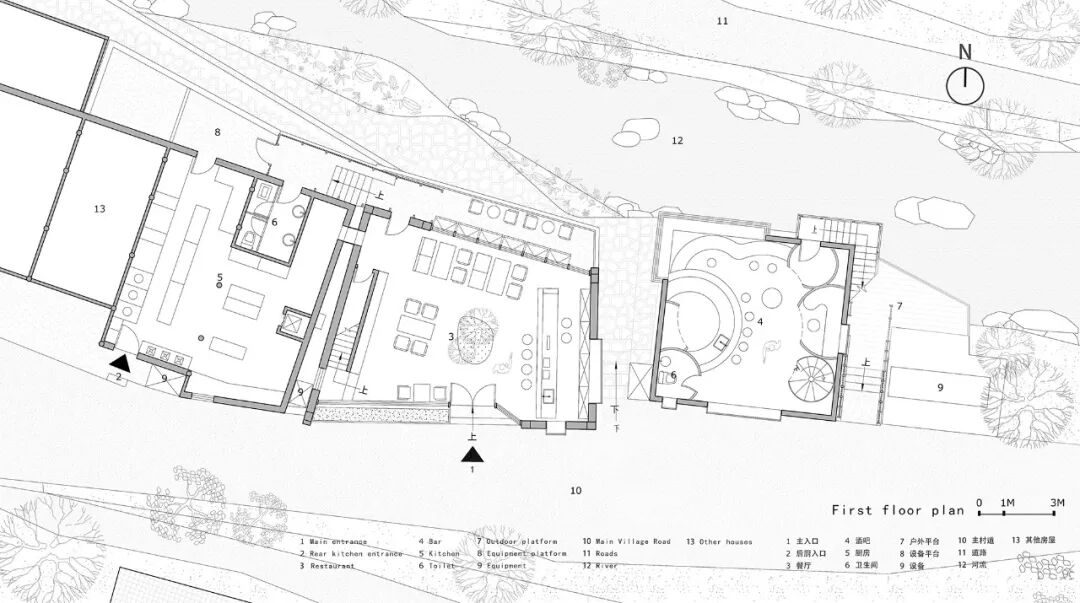 餐厅作为整村文旅民宿综合体配套公区的一部分,位于进村就能看到的溪边,由一个发电站改造加建而成。进村道路不宽,只有3米多,一侧是高起来的地形石坎,为保持街道的整体性,我们将建筑的外边界线控制在老建筑的边界内。餐厅的正立面朝向村道,建筑的一层用整体的大玻璃面向街道打开,沿用老房子的界面往里退让。大玻璃面让建筑的一层空间和街道之间发生更多紧密的关系,里外互动,空间渗透。同时过往的路人也能轻松的关注到餐厅水吧空间,很自然得被吸引进来。