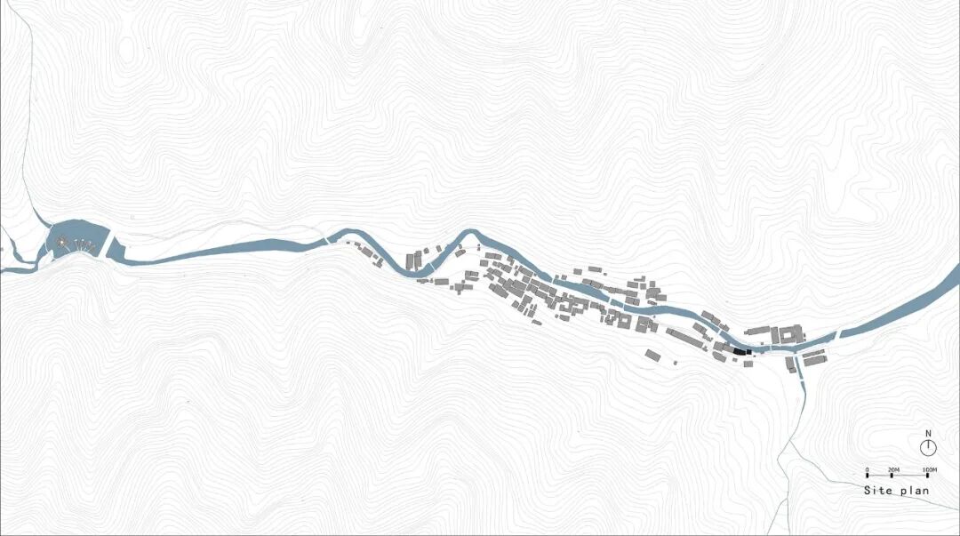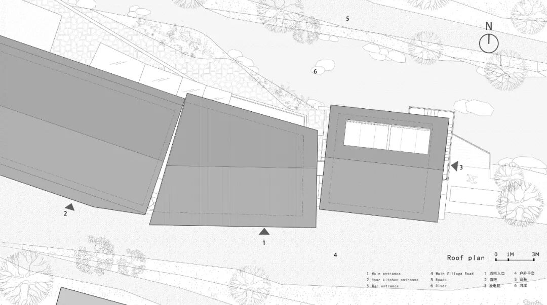 餐厅建在溪边一个梯形的地块上,由于使用面积紧张,我们选择把建筑的边界撑满了整个场地。因此建筑的形体也是一个不规则的梯形,平面上看只有一个角是直角。屋顶的屋脊与道路的边界平行,屋顶的檐口在一侧水平,另一侧则变成了“斜刘海”。这种屋顶形态在村里也随处可见,由于地形的关系许多老房子都采用这种斜的屋檐。不那么正的屋檐与溪流及周边的建筑形成了非常生动有趣的关系,使餐厅犹如长久生长于此。