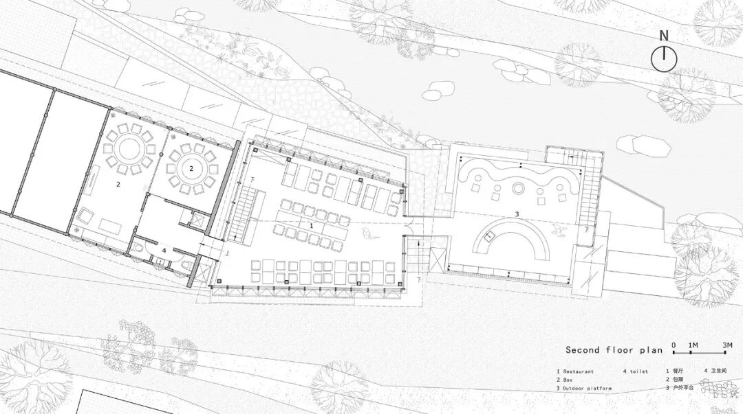 “桥上的人在看风景,看风景的人在楼上看你”,事物之间相互依存、相互关联,才让生活充满诗意。在古桥上回看餐厅,餐厅是一道风景,同时在餐厅室内又能将老樟树和古桥溪流尽收眼底。人与人之间既有距离感,又通过看与被看连结,在空间的表达中加入此种暧昧的关系也是趣味所在。