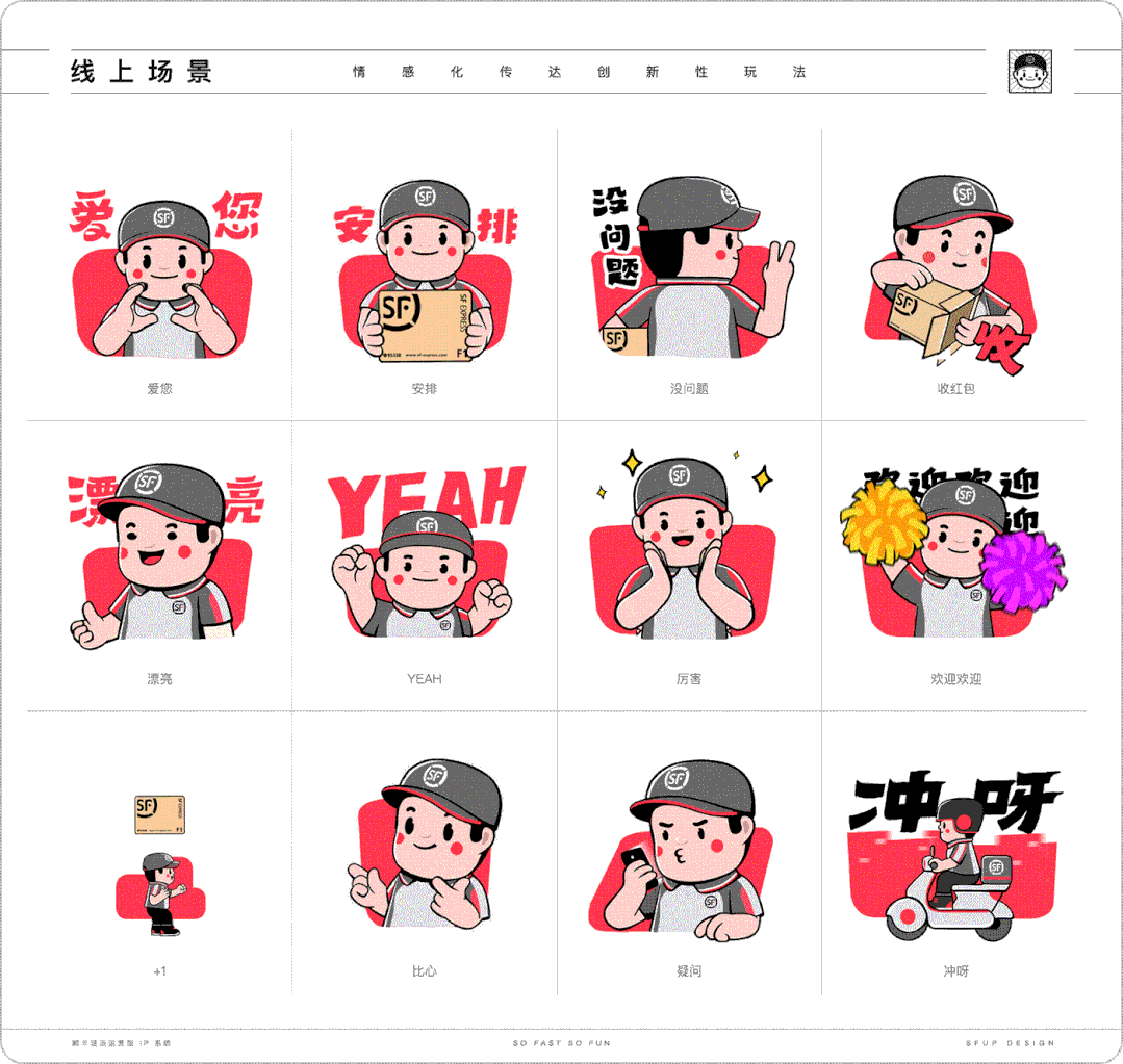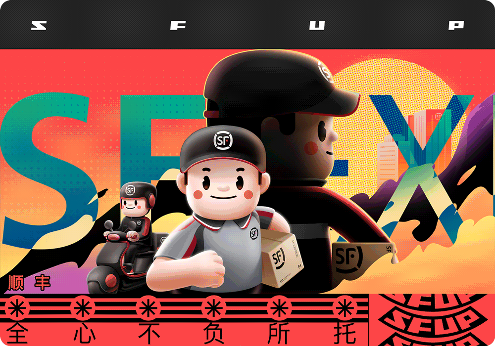 全新品牌形象由顺丰旗下设计团队SFUP_DESIGN创作完成,据悉,整体形象由顺丰Logo延展,方圆共济的外轮廓,Logo上的红点转变为腮红,还保留了顺丰快递小哥的服装元素,让IP形象具有品牌辨识度,打造一个具有人情味和温度的快递小哥形象。