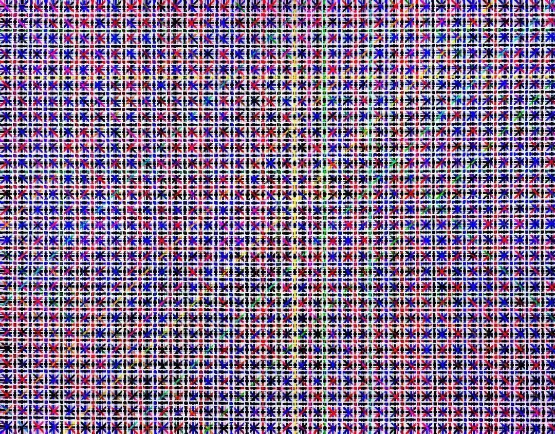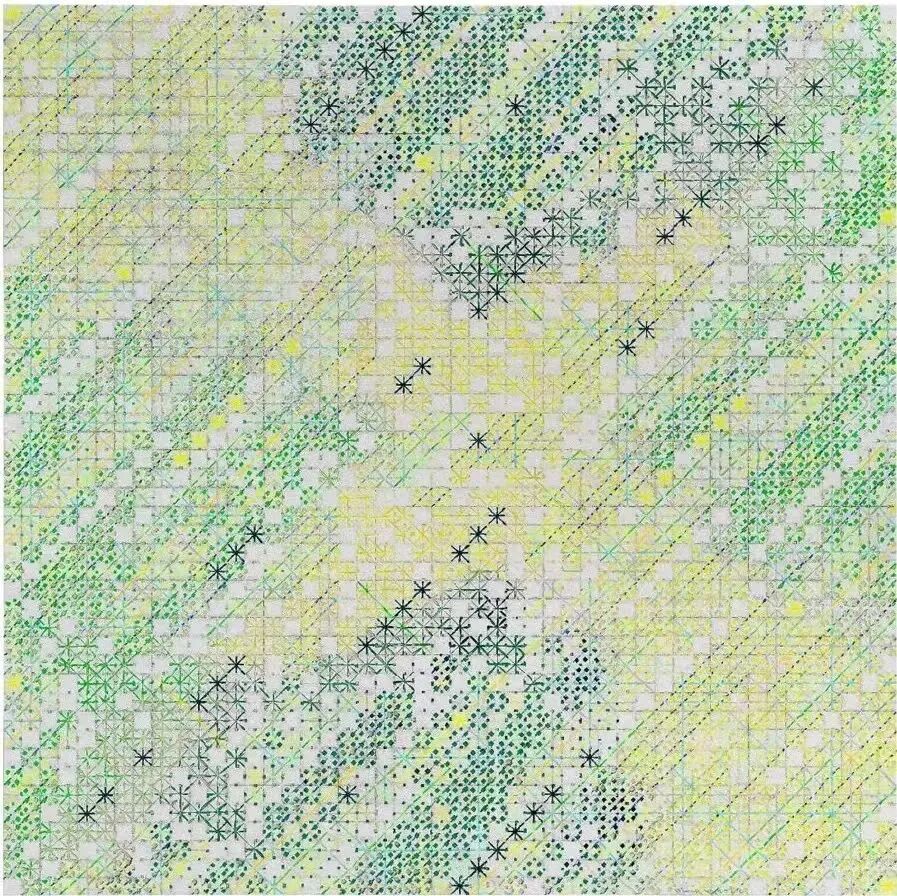 丁乙老师将三十多年的创作概括成了三个视角阶段:平视、俯视、仰视。每个阶段差不多十年。第一个是没有透视的平视阶段,在绘画里面表现出平视,从“十示”的最开始,一直到1998年。当时丁乙老师想要成为一个形式主义画家,所以对于形式的追求是作品的一个主线。在这十年里有非常丰富的变化,比如从严谨到口语化的转变、用现成的成品布、不同的材质和不同的画材的实验等等。