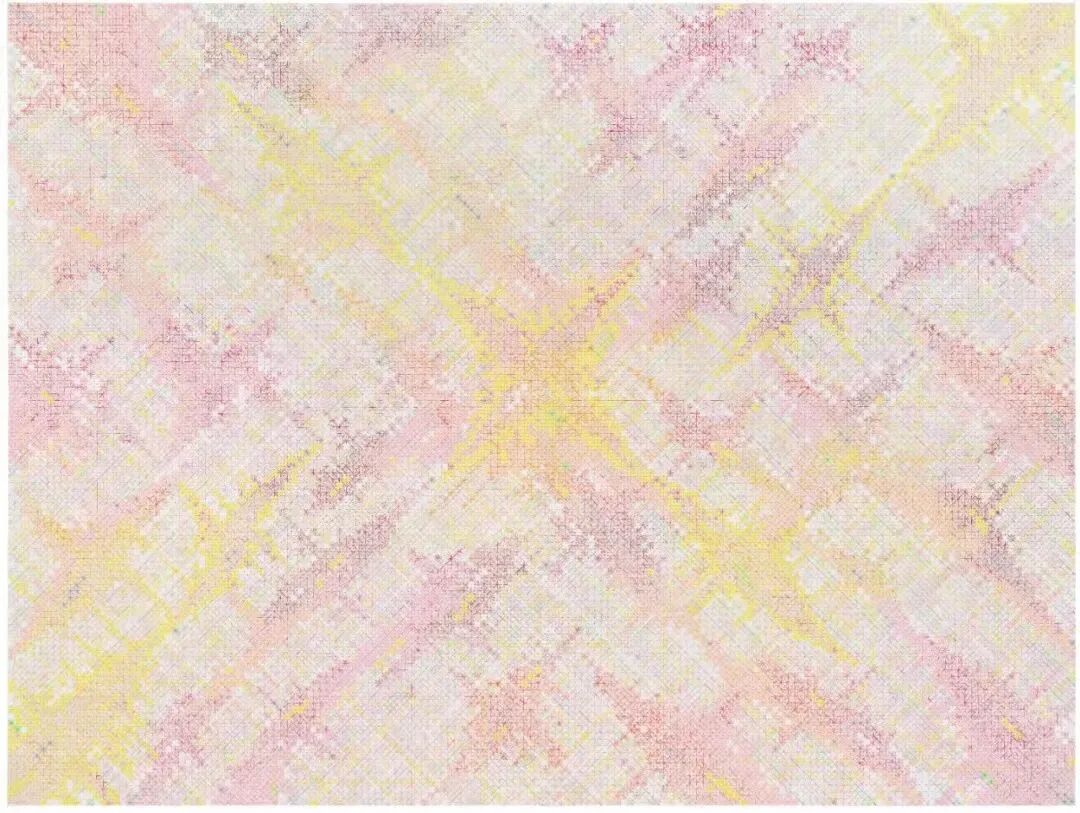 第二个阶段丁乙老师称之为俯视阶段,从1998年到2010年这个时间。丁乙老师的作品以俯瞰城市的角度去进行绘画创作。他的创作渐渐的从平面的形式主义表现过渡到对社会议题城市化发展的表达。这时候他生活的上海开始灯光工程,整个城市沉浸在繁华而绚丽的霓虹灯中。这个时间段丁乙老师的作品中多为绚丽的荧光色,这个时间段城市发展十分迅速,因此我们可以看出在这个时期作品的画面中更多的呈现给我们一种速度感。第三个阶段是仰视阶段,丁乙老师在这个阶段所表达的更多的是对自然的敬畏之情。