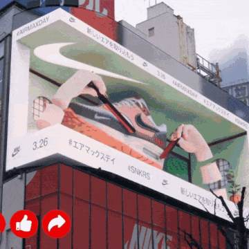 Nike日本公司在新宿新地标建筑的曲面屏幕上投放了一支3D广告。3D网红虚拟猫将标志性橙色运动鞋盒从屏幕中“推出”,盒子打开后展示了多种配色的 Air Max,十分引人瞩目。