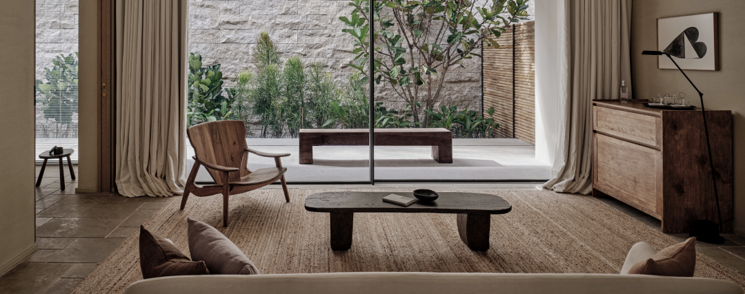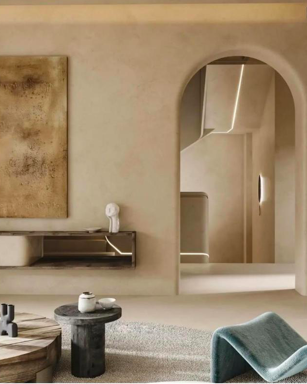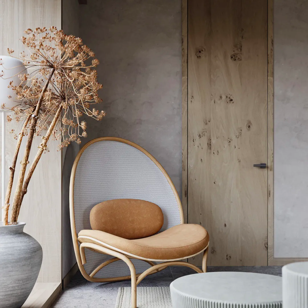近些年“极简主义”思潮的兴起将源自日本清冷而禅意的“侘寂风”一路送到网红内装顶流。然而,在日常室内设计中,业主虽向往质朴禅意的格调,却似“叶公好龙”般对“原味”侘寂风的实际接受程度并不高。因此,将原本的侘寂元素与更为大众接受的极简风格进行融合,创造出一种更为简约质朴的“轻度侘寂”氛围。这样便从现实角度满足了业主的多重需求。