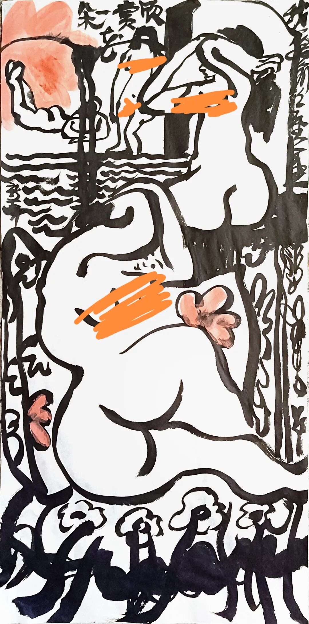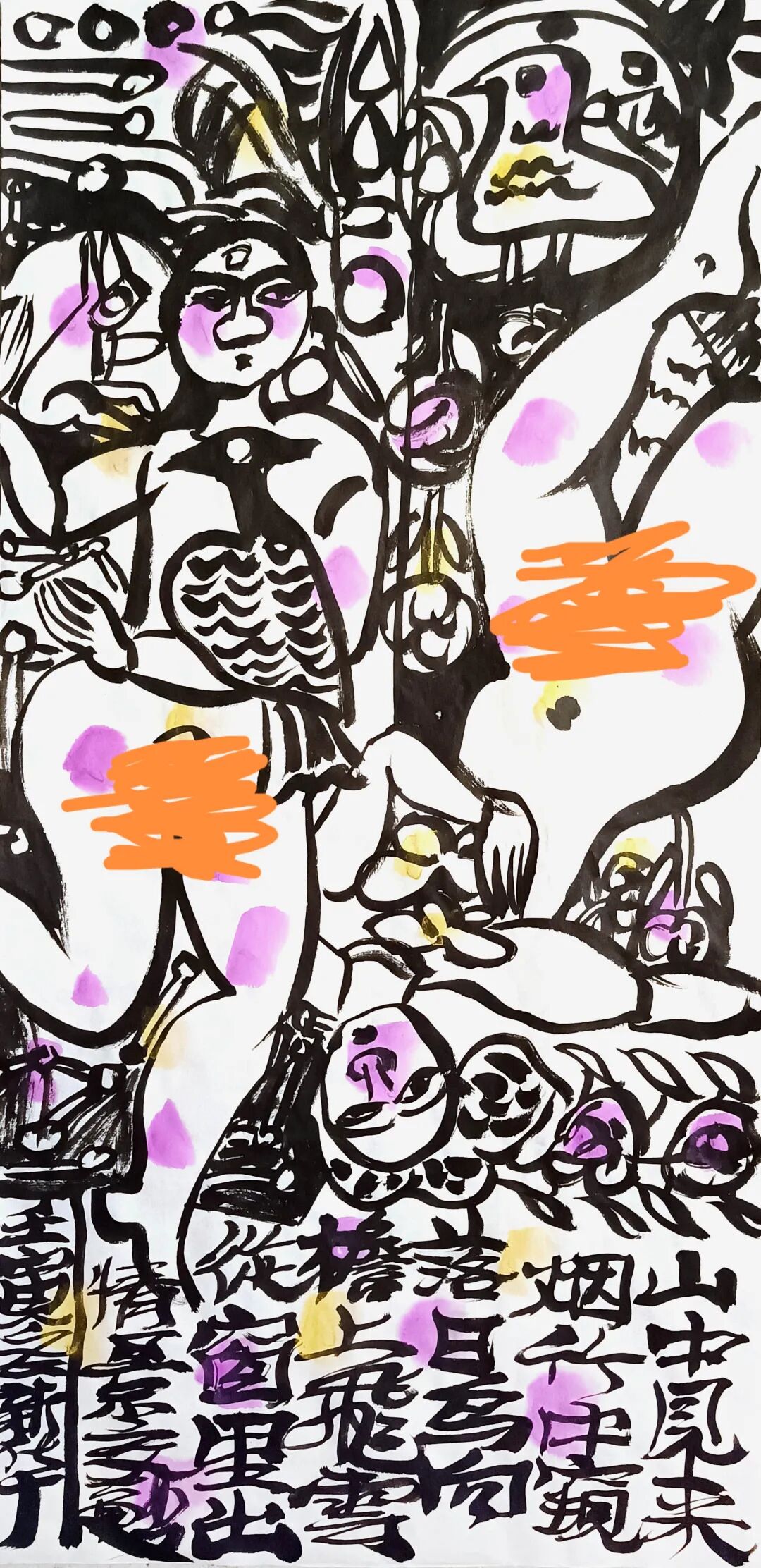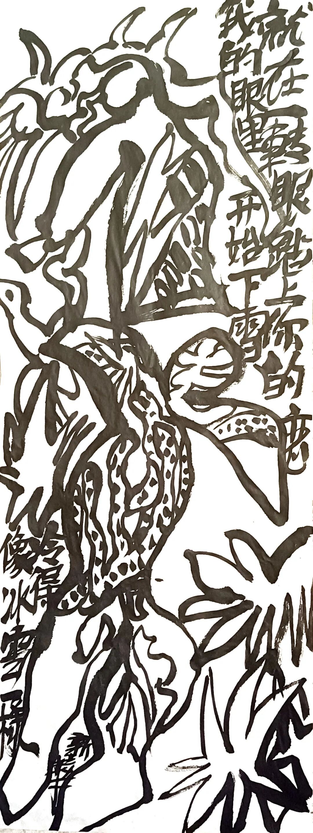 中国画近似图案,但不是图案。图案是劳作,画画是玩,图案是认真,画画是若不经意。太认真的人画不好画。图案是每根线都平均用力,有规律可寻,画画是每根线不能一样,图案是死板的,画画是灵活的。就像气功,太用心就走火入魔了?画画的根本精神状态是兴奋的,不完全受理性控制,自以为入心的在画是入了魔,画画的心是又在又不在的。跳来跳去不受限制,是自由的,灵动的。