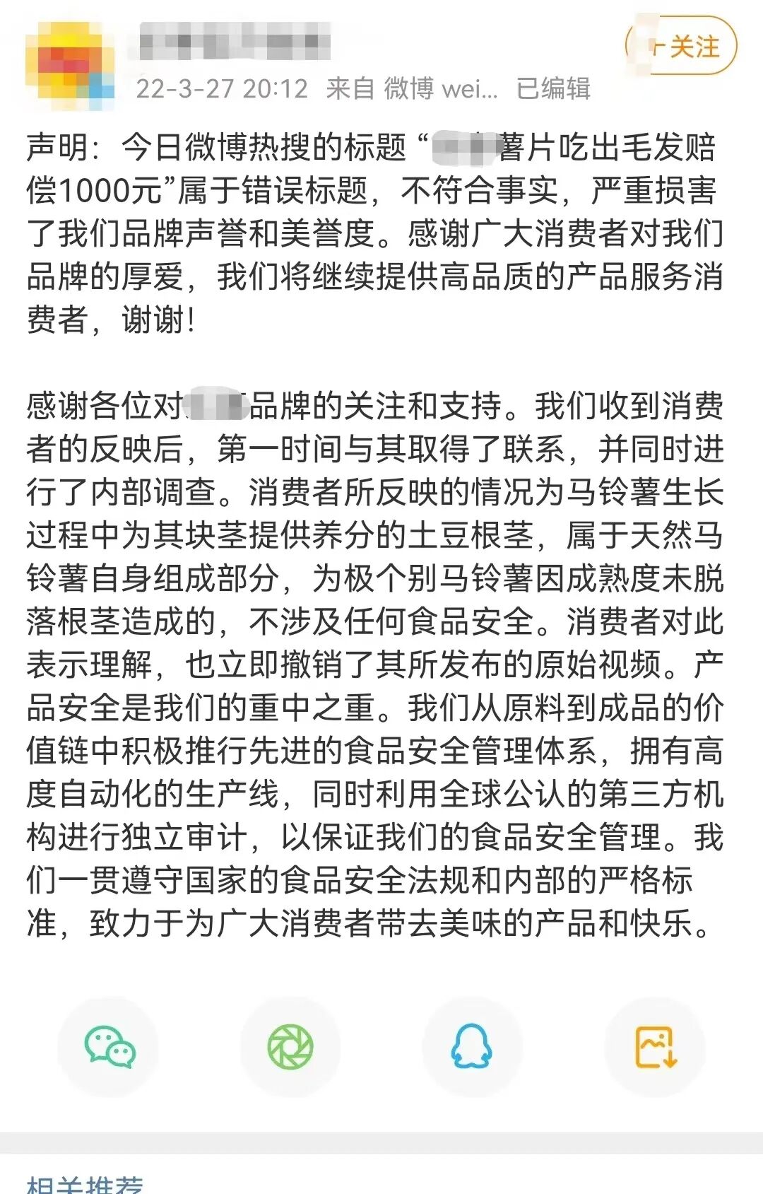 有一网友从薯片中吃出了“一撮毛发”,对此,该品牌回应:“消费者所反映的情况为马铃薯生长过程中为其块茎提供养分的土豆根茎,属于天然马铃薯自身组成部分,为极个别马铃薯因成熟度未脱落根茎造成的,不涉及任何食品安全。”