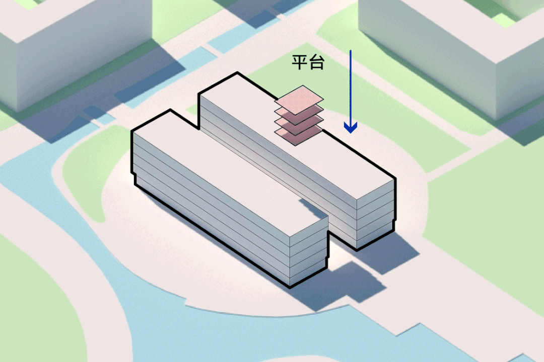 答案是,将垂直的平台以退台的形式分布,并用楼梯将他们连接,一直到被架空的底层,为人们从底层到顶楼创造一条连续的交通动线。