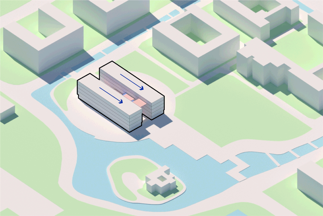 两个体块之间的交通动线十分低效,从一个体块到另一个体块必须要先下到一楼,再上另一栋楼,这样就产生了许多的无效的交通动线,并且人们的使用体验也很差。