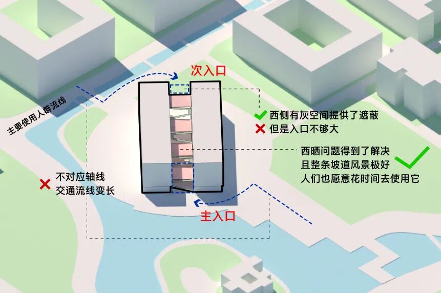 在笔者看来,只要给书山坡道调转个方向,就会更加符合场地逻辑,而目前的坡道朝向却偏偏是3个方案中缺点最多的。那么,究竟是为什么目前的坡道需要朝西呢?