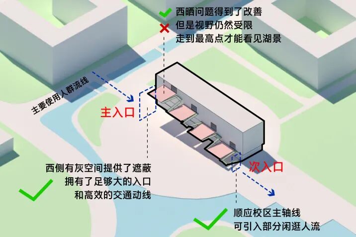 1. 西侧作为主要使用人群入口,有了灰空间提供了遮蔽,而且拥有了高效的交通动线和足够大的入口