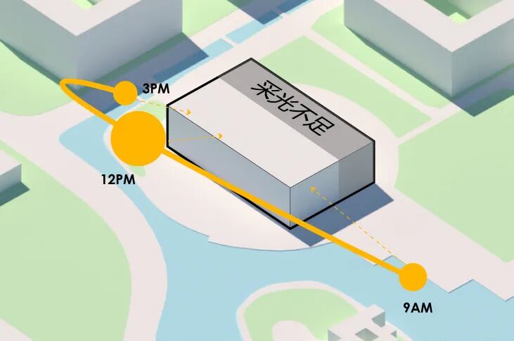 从图上我们可以看到南北向切面采光时间短,采光面积小,室内光线效果差。而且没有顺应校园轴线,交通动线也会变得冗长,所以这个方案Pass。