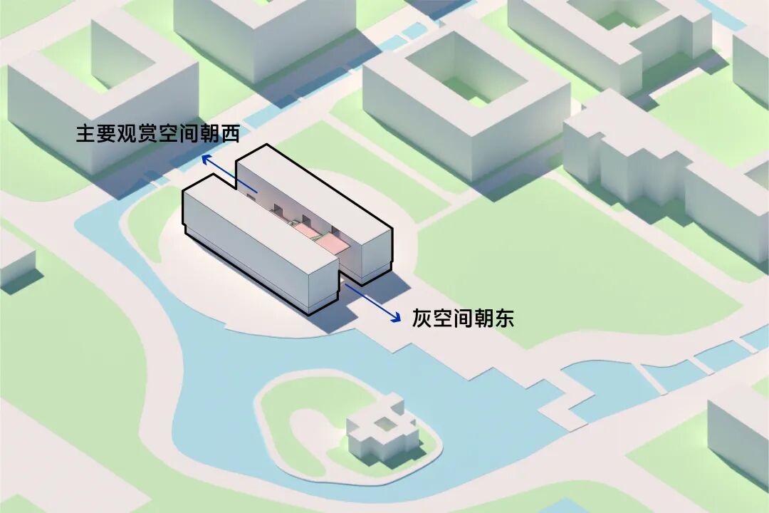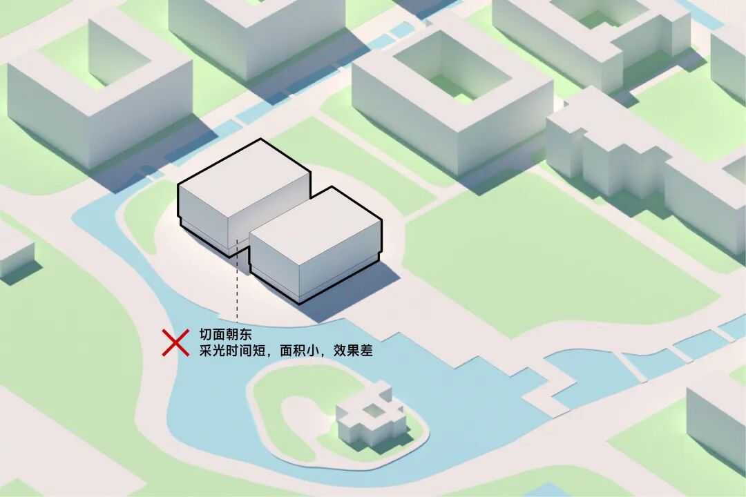 而东西向切的话,采光时间长,采光面积大,室内光线效果也变得更好。而且东西向的切面,对应了校园轴线,与东西校门和西面的宿舍楼形成了连续且统一的交通动线。