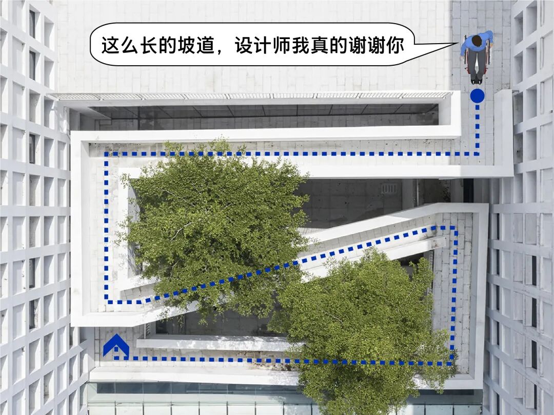 根据图片来看,坡道的斜度似乎符合轮椅的规范,但是如果说坡道的使用是为了使轮椅使用者也可以顺利上去,那么多增加几个电梯不行吗?