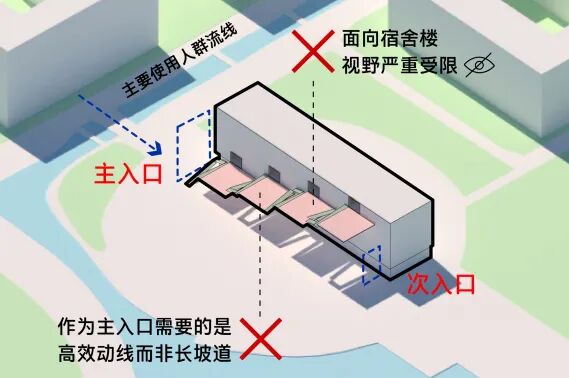 2. 次入口顺应主轴线面向东校门,且是退台的起点,可引入部分闲逛人流。
