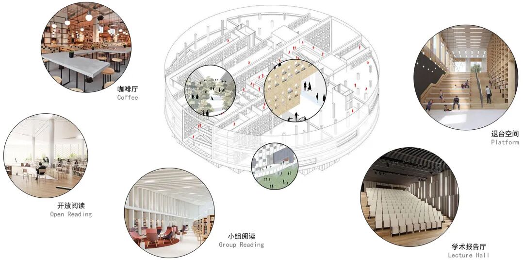 功能包括藏书阅览、展览会议、研究讨论、学生活动、休闲娱乐、办公辅助等。可以先大致分为公共功能和私密功能。