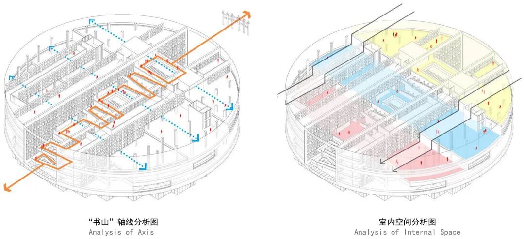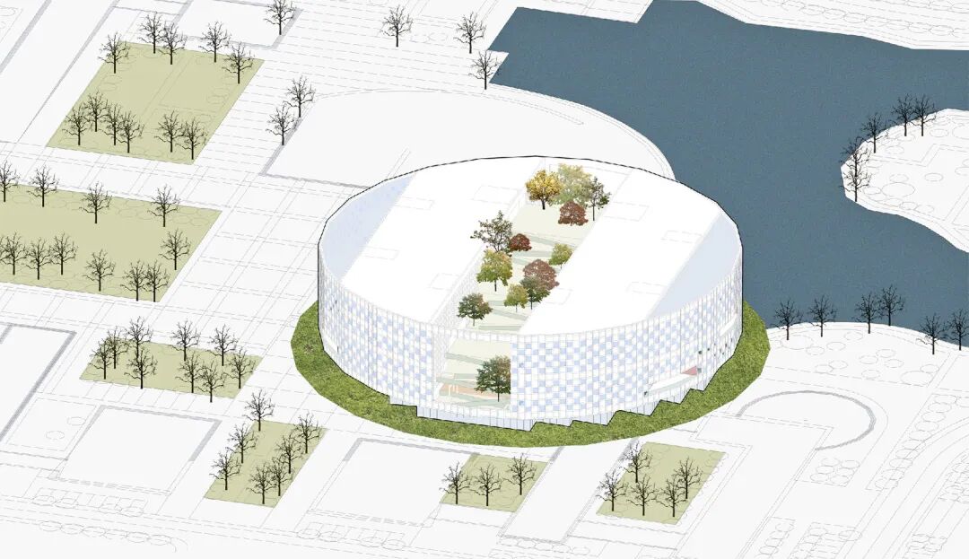 至此,图书馆已大致完成。但建筑师为了适应场地,又给矩形体块直接套上了一个圆形外壳。