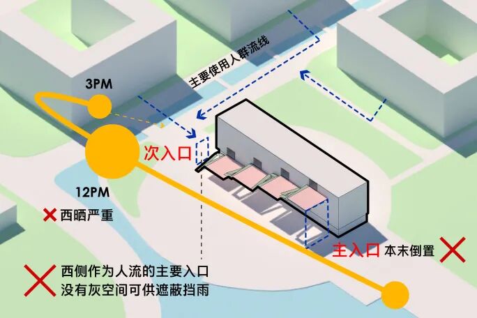 2. 西侧作为主要使用人群入口,却没有灰空间提供遮蔽。