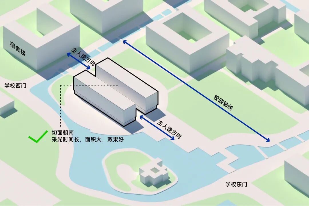 场地作为地标位于校园东西向主轴线的核心,主要人流来自西面与北面的教学楼与宿舍。由于场地南面临水,北面绿地,主入口只能选择东或西侧。