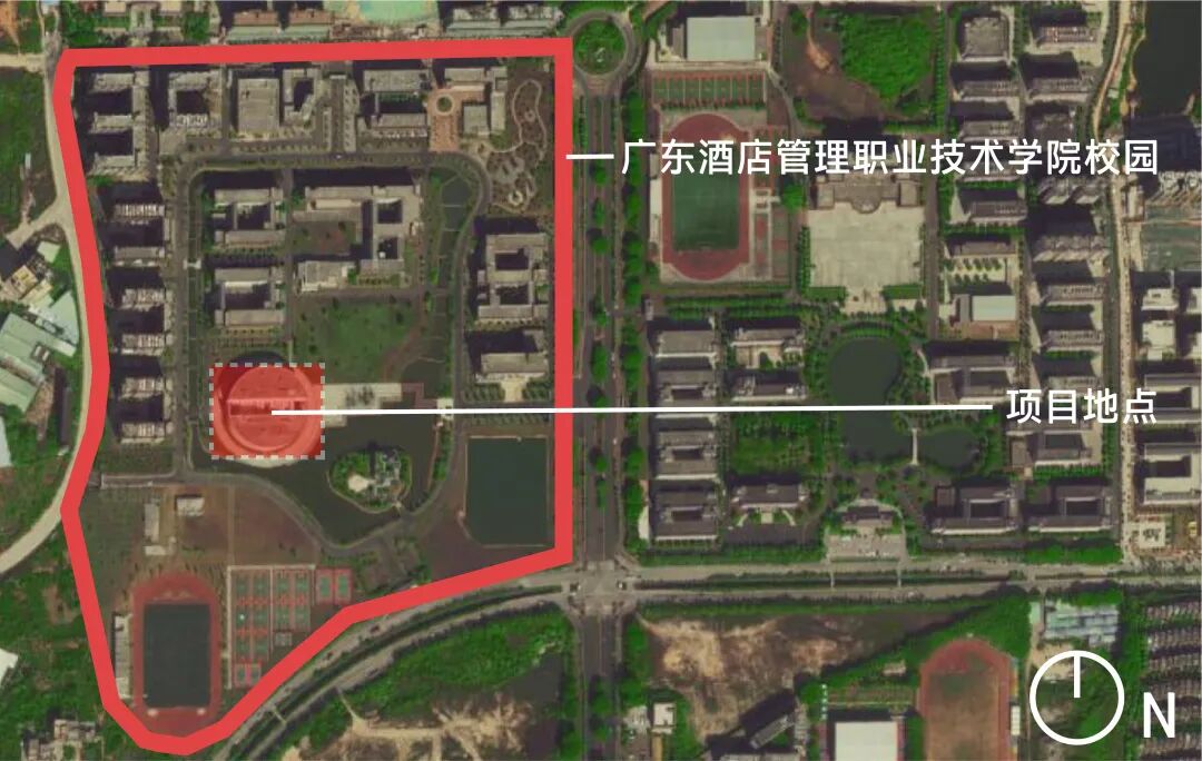 场地南面是开阔的湖面水系和活动场地,西面与北面则隔中心绿地与主教学楼群相望,东面正对着校门。