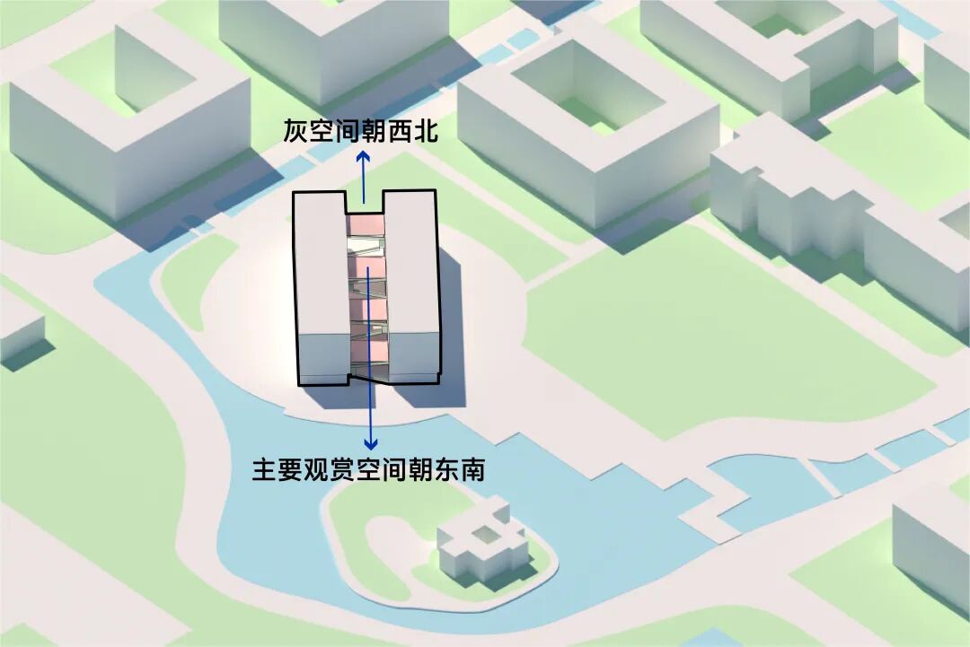 不如……直接切一刀,把大体块一分为二。兼顾了采光和通风,让建筑更加节能。