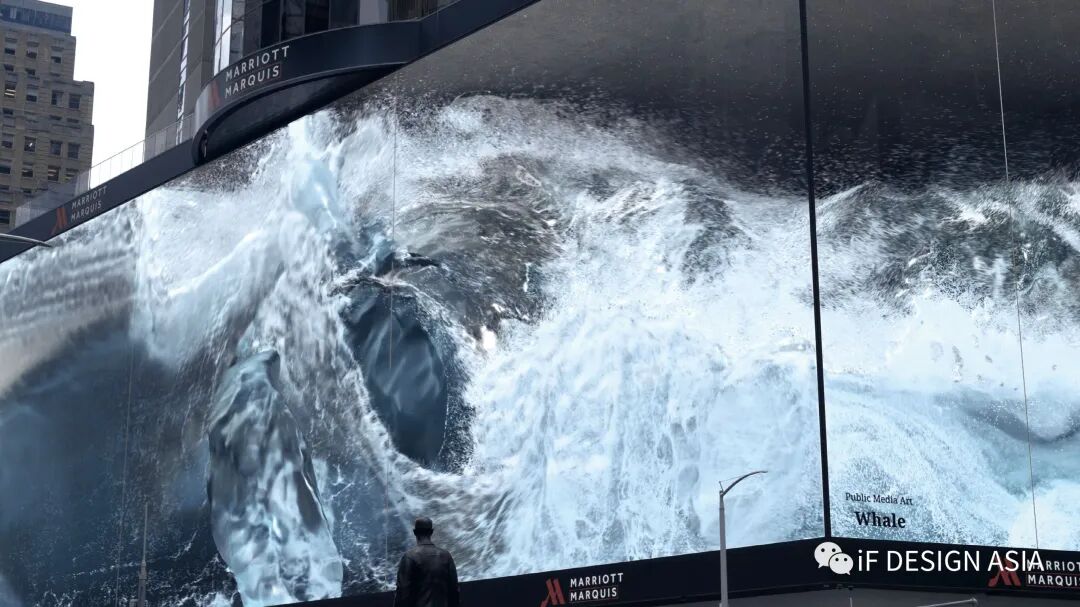 荣获 2022 年 iF金质奖的装置 “鲸鱼#2”(Whale #2)是一件公共数字艺术作品,它将纽约时代广场 1,400 平方米的广告屏幕变成了一片波澜起伏的 3D 海洋,画面中一头鲸鱼乘着海浪自由遨游。“Whale” 并不是第一个荣获 iF设计奖的公共艺术作品:在 2021 年,d’strict 创作的 “WAVE”(海浪)公共数字艺术作品也同样从 9,509 件参赛作品中脱颖而出,以最高分获得 iF金质奖。多年来,d'strict 总共有 16 个项目获得 iF设计奖,其中两个获得金质奖!
