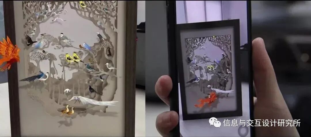 纸雕起源于中国汉代,选取传统的纸雕是为了发扬中国非遗物质文化遗产,在其发展过程中,技术和传统艺术的融合,使其得到了创新,再加上主题选自中国的传说故事——“百鸟朝凤”,孩童在参与当中,能够更好自主的接受中国文化。其次,立体纸雕灯美观,可以用做装饰品,最后,当纸雕与AR结合加大了互动体验感,主要依托于移动端的屏幕,观者通过点击屏幕中的鸟的模型,可以识别出不同鸟类的叫声,让观者有了很强的参与性,从而在增加趣味的同时,也让观众学习到了不同种类的鸟声。