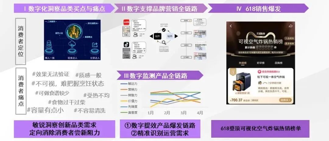 另外,宝尊所创造的爆品罗盘,也同样给予了服务商更多的助力。作为天猫生态实验室数字化加速器合作伙伴,其运用在在货品全生命周期运营的丰富经验,与生态实验室共同打造【爆品罗盘】,基于对消费者群体洞察分析、数字化算法模型和专业调研生态联盟,以及全链路+数字化工具+小样本,共创新品,打造爆品。而这样的例子同样有很多,例如说在618之前,某家空气炸锅的品牌营销力有所下降,而在宝尊的调整下,在618期间该空气炸锅的销售爆发远高于预期。