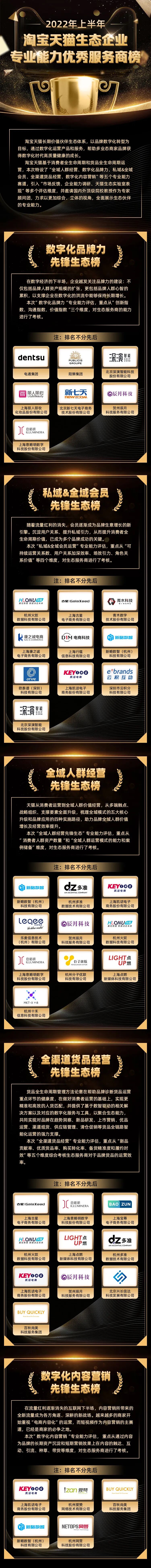 在榜单中,淘宝天猫特设了「全域人群经营」、「数字化品牌力」、「私域&全域会员」、「全渠道货品经营」「数字化内容营销」等五个专业能力赛道,在引入国内外顶级院校教授作为专家顾问团,并结合市场反馈、企业能力调研、天猫生态实验室表现等多个评估维度后,向大众立体的、全方位的展示了生态伙伴的专业能力。