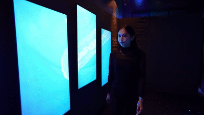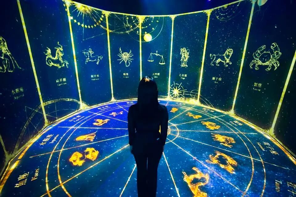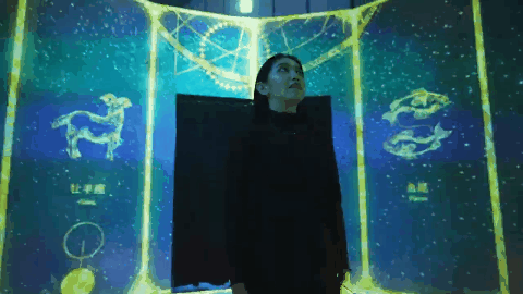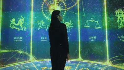 接下来就来到占卜环节了,作品HOROSCOPE是一个关于12星座的360°沉浸式空间,驻足在新媒体艺术空间中,你将感受梦幻的星座变化,宇宙的绚烂,感受尘封于自己身体中的星座物语,将自己的灵魂融入到十二宫图中,与自己的本质面对面。