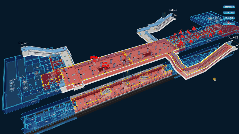当站内发生火警时,由边缘侧火警传感器触发火警告警,虚拟场景接收边缘侧火警信号,同时解析信号内容定位告警位置,同时进行场景联动。在灾难发生时,可视化系统可迅速知晓问题所在,便于消防人员进行对应方案的执行、完成最优逃生路线的规划,调用告警系统和广播等形式提醒车站内人员逃离危险,确保站内内人员生命财产安全。