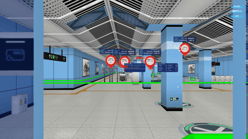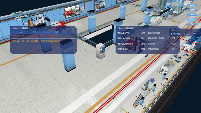 车站设备可视化:将站厅内的人体测温、X 光机、闸机、电梯等关键设备动态高度仿真复现,深度集成电力、环境、门禁、电能质量等监控系统,联动后台接入真实数据,通过 3D 视图感知设备与资产的信息属性,如点击设备模型,查询单个设备的故障、位置、状态等数据信息。