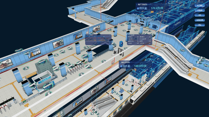 案例使用写实风格多维度展示三维地铁站,360 度全景可视化结合数据场景联动,建立一个综合型的智能车站三维可视化系统,实现车站的站厅层、站台层、设备层的逐级可视;集成物联网平台数据,以车站的智能监控为重点,包括客流监测、智能巡视、设备监控、电子巡更、智能安防、智能消防等各种管理系统,构建车站管理的监控、预警、诊断、分析一体化的三维可视化平台。并且实时对接后端数据,将整个车站构建成可视、可查、汇聚的智慧车站。
