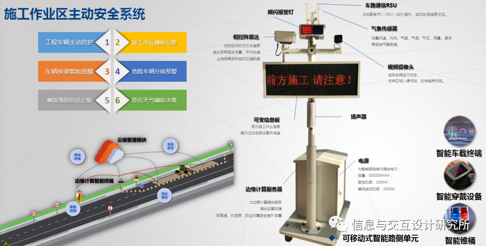 全方位信息采集和智能控制:加强针对事故多发路段、恶劣天气多发路段、施工路段和交通交织路段的智能化分析和管控,路上设备主要有视频识别设备、交通监测设备、通信设备、气象设备、 特殊气候诱导设备,以及支持5G和北斗定位的智能物联网感知终端。