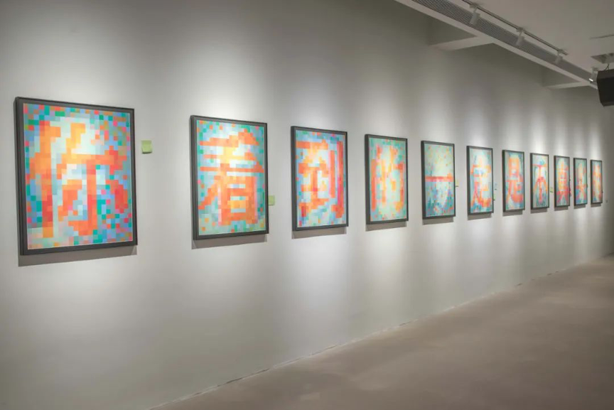 艺术家杨宏伟的新作《你看到的一定是不真实的》是在公众面前首次亮相。一眼望去,这是一排11幅由清晰可见的彩色像素方块组成的汉字作品。但这就是全部吗?不! 从最初,艺术家以文字提示你,这只是表象。