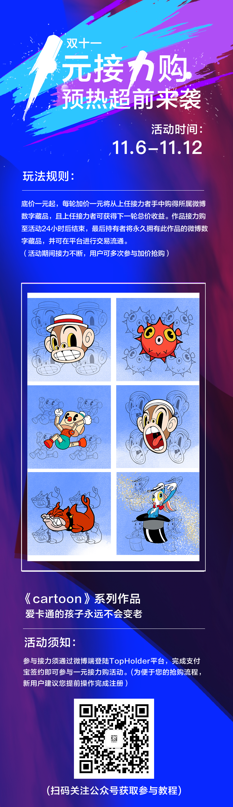 参与接力须通过微博端登陆TopHolder平台,完成支付宝签约即可参与一元接力购活动。