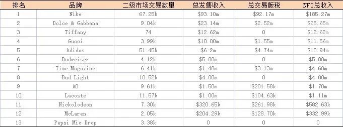 根据Dune Analytics 最新数据显示,在所有以太坊上发行 NFT 收藏的品牌中,耐克以1.8527亿美元的总收入排名第一。