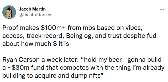 此外,Proof Collective的联合创始人之一瑞安·卡森 (Ryan Carson) 因大规模争议而被罢免,这引发了对该计划未来的猜测。他在Moonbirds推出后不到两周就离开了该品牌,开始了他自己的NFT风险基金项目。