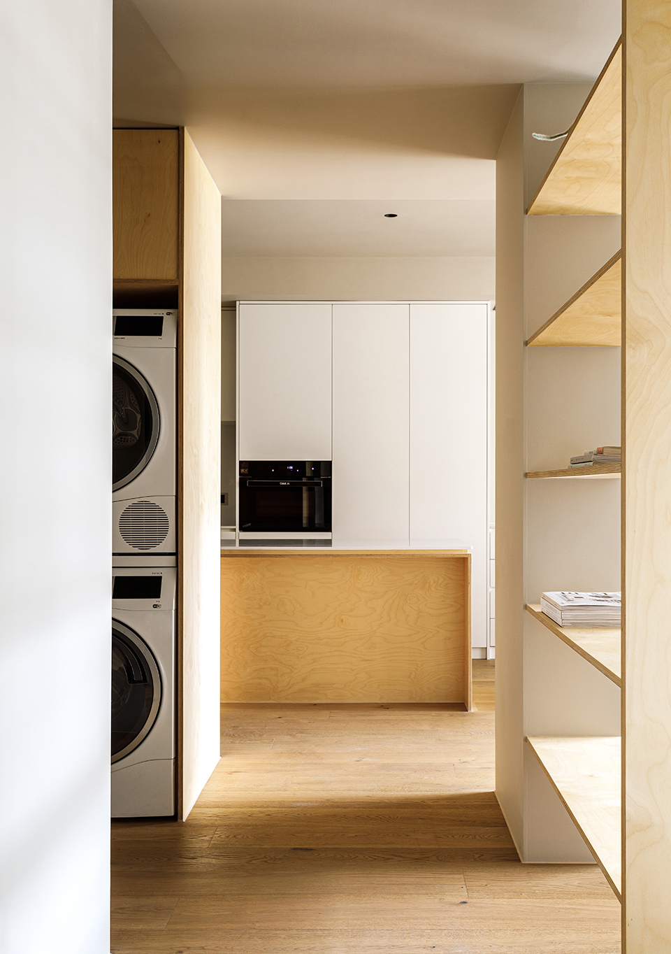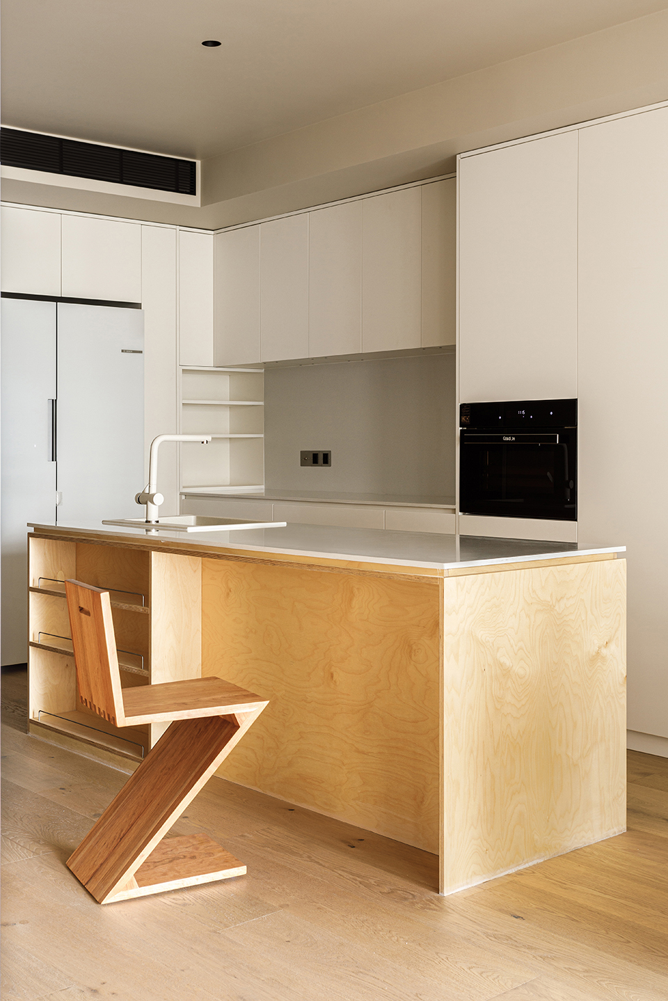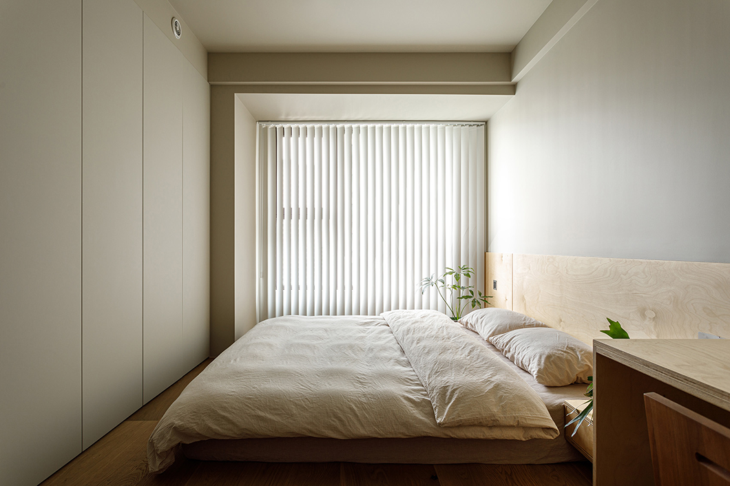 主卧设计了地台加床垫的方式,桦木板制作床头板及书桌,保持空间材质和视觉上的统一。