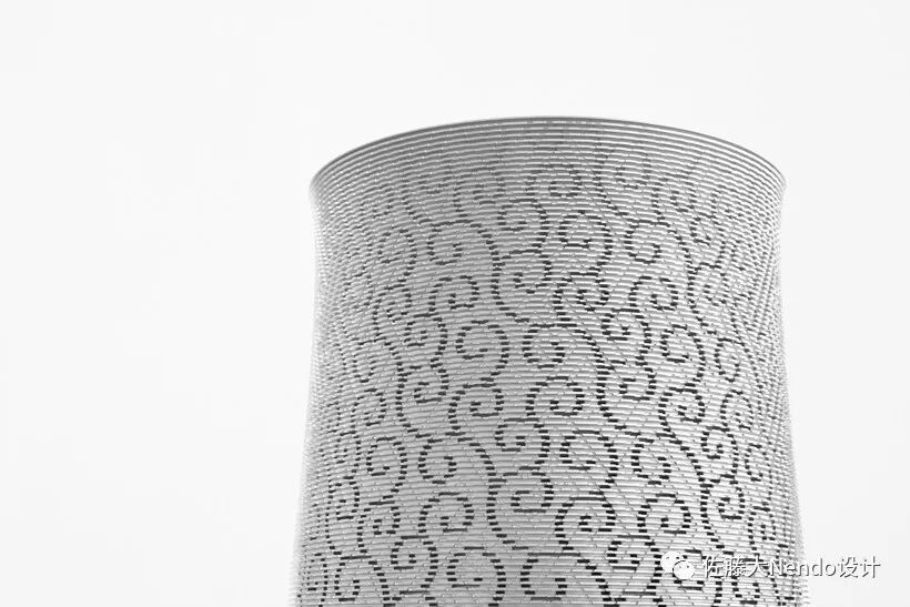 This calculated process results in the creation of a four-layer surface with different depths, allowing the patterns to appear visually according to the angle in which the vase is viewed. The dimensions and proportions of this process were carefully examined and tested due to the effects of deviations; if the initial grooves are too deep, the dark casted shadows will visually block the pattern, conversely if it is too shallow, the two patterns will blend together without a distinct separation.