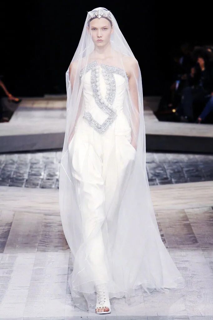 Matthew M. Williams将年轻的生命力注入到Givenchy的设计中。闪着金属光泽的铆钉、镶着宝石肩带与素色的套装形成了鲜明的对比,一动一静间展示着服装带来的优雅与灵动。