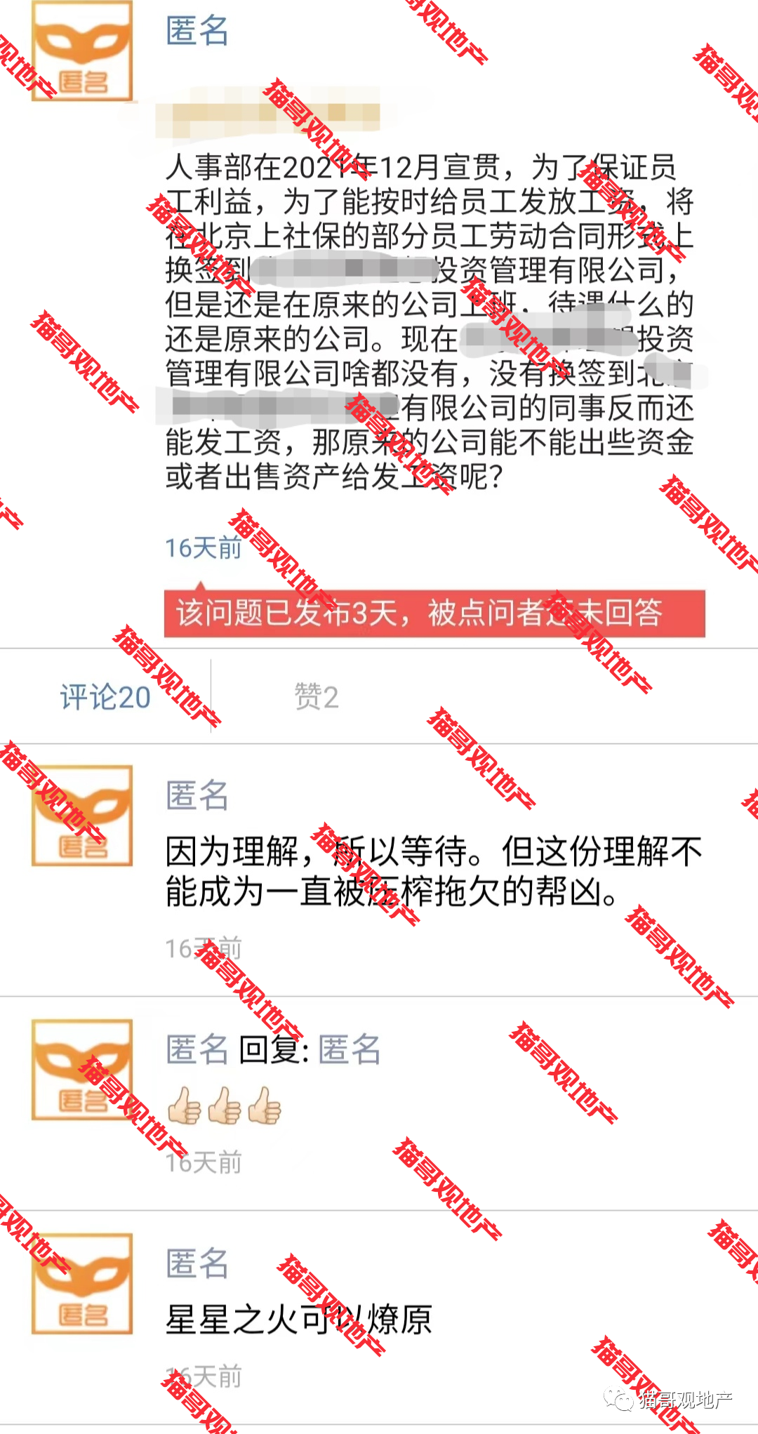 在大量欠发员工薪酬的同时,猫哥了解到的这家房企还在陆续处置资产,偿还部分债务和利息。员工的这点欠薪,这家房企还是有能力解决的,但是没给放在优先级别,这就很难办了。