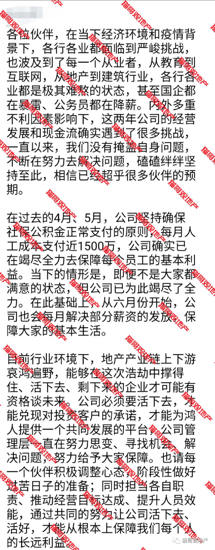 有一家百强房企(后台回复:工资,获知名字提示),已经欠薪很长时间,3456月份的工资,大部分员工至今都没发,换签合同的员工,发了部分5月的工资。