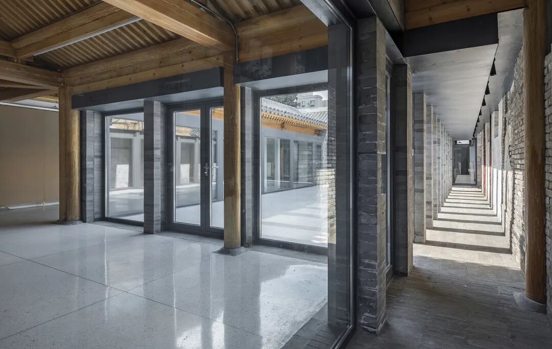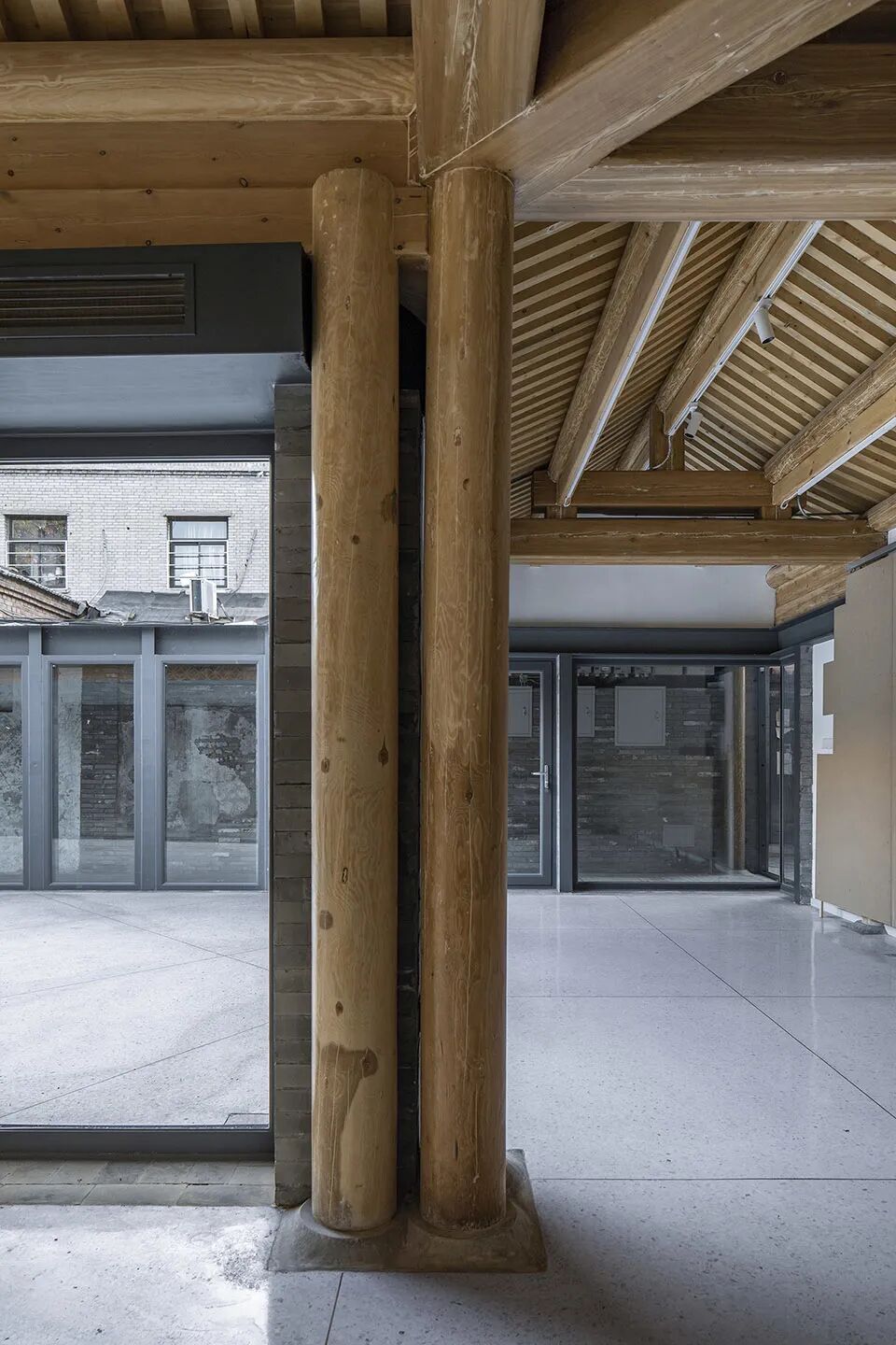 设计没有使用复杂的结构形式与昂贵的材料。仅仅使用了四种最普通的材料:木头、灰砖、钢、玻璃。建筑主体釆用北京传统木构,而提供新功能的部分:如玻璃窗、隐形空调风口等则采用钢结构与玻璃,而灰砖则因位置而定,采用传统与现代两种不同的构造做法,并承担新与旧的衔接与转译。