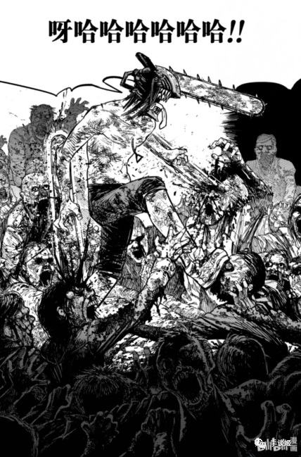 再举例下,在漫画中,电次攻击僵尸恶魔是把手臂伸进了恶魔的眼窝里,用脚抵住了僵尸的嘴,而在清洁杂鱼僵尸的时候,则能够看到眼珠爆出的画面以及僵尸本身也有着一定的表情(人性意味),这就使得砍僵尸的行为更加的爽快、疯癫、更加B级片。