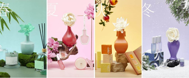 节气盒子成立于2017年,2020年开始切入C端市场,以“节气”为品牌概念打造东方生活消费品牌。目前已推出四季茶气、四季流心、气味旅行、东方瓶花等系列产品,共计约100个产品SKU,产品涵盖香薰蜡烛、香薰晶石、无火香薰、车载香薰等品类。